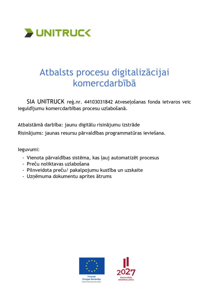 Papildus šīs atbalsta programmas ietvaros SIA Unitruck ieviesa arī resursu vadības sistēmu (ERP). ERP risinājums tiek ieviests ar mērķi sakārtot uzņēmuma noliktavas procesus, preču kustību un uzskaiti, nodrošinot precīzāku un efektīvāku resursu pārvaldību.