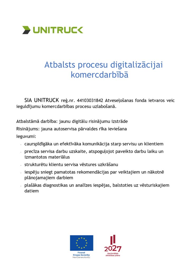 Izmantojot šo atbalstu, SIA Unitruck īstenoja būtiskus uzlabojumus komercdarbības procesos, ieviešot modernu autoservisa pārvaldības risinājumu.